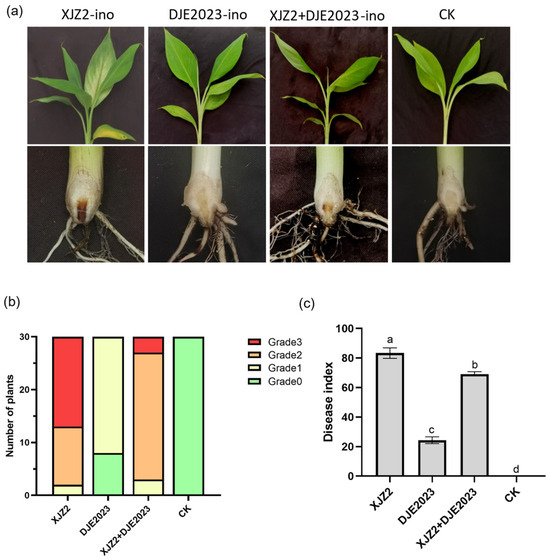 In another trial, ‘Baxijiao’ plantlets were inoculated individually and jointly with spore suspensions of XJZ2 and DJE2023 at a concentration of approximately 5 × 106 spores/mL. After 45 days, banana leaves inoculated solely with XJZ2 showed partial yellowing, longitudinal rhizome sections, and pronounced browning at the base of the rhizome with a spreading trend. In contrast, DJE2023 single inoculation resulted in minimal yellowing of banana leaves, with robust and healthy root systems, unaffected rhizome sections, and no browning at the rhizome base. Leaves inoculated with either XJZ2 or DJE2023 exhibited mild yellowing and limited browning, while the negative control group showed no signs of disease (Figure 3a).