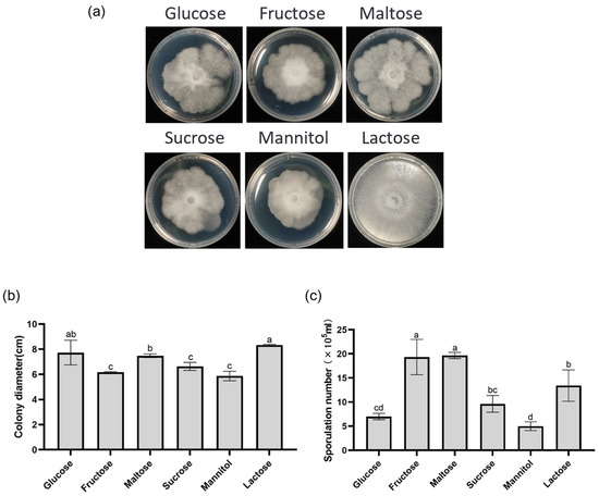 Effects of carbon source on colony morphology, growth diameter, and sporulation of DJE2023. (a) The effect of carbon sources on the colony morphology of DJE2023. (b) The effect of carbon sources on the growth diameter of DJE2023. (c) The effect of carbon sources on the spore production of DJE2023. All data are presented as the mean ± standard deviation (n = 3). The significant difference (Duncan test, p < 0.05) between two groups is represented by the superscript letters above the error bars.