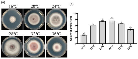 Effect of temperature on the morphology and growth diameter of DJE2023 colonies. (a) Colony morphology of DJE2023 under different temperatures. (b) Effect of temperature on the growth diameter of DJE2023. All data are presented as the mean ± standard deviation (n = 3). The significant difference (Duncan test, p < 0.05) between two groups is represented by the superscript letters above the error bars.