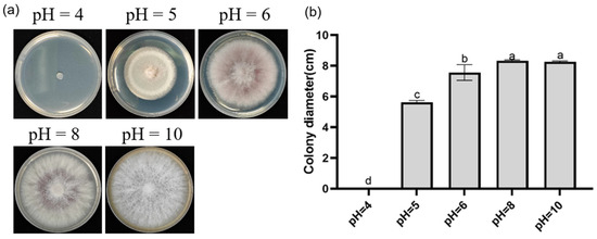 Effect of pH on colony morphology and growth diameter of DJE2023. (a) Colony morphology of DJE2023 under different pH levels. (b) Effect of pH on the growth diameter of DJE2023. All data are presented as the mean ± standard deviation (n = 3). The significant difference (Duncan test, p < 0.05) between two groups is represented by the superscript letters above the error bars.