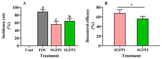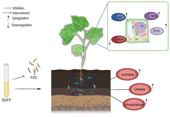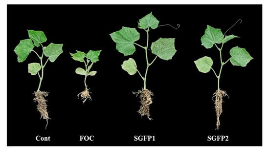 3.2. Effect of SGFP on Preventing and Treating Cucumber Wilt Caused by FOC