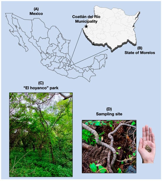 (A) Map of the Mexican Republic; (B) State of Morelos; (Star) Coatlán del Río Municipality; and (C) a picture of the site of sampling at the Eco-touristic park El Hoyanco; (D) sampling site.
