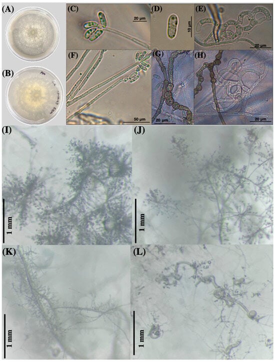 Macroscopic view (A,B), microphotographs (from a compound microscope, (C–H)), and views from a stereomicroscope (I–L) of Potato Dextrose Agar plates of the nematode-trapping fungus Arthrobotrys mendozadegivensis; aspect of free-living nematodes of Panagrellus redivivus species captured by three-dimensional adhesive nets of the fungus on the water agar surface (L); aspect of three-dimensional adhesive nets (E,H); and catenulated chlamydospores (G,H).