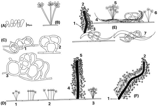 Representative scheme of the development of aerial structures of the nematode-trapping fungus Arthrobotrys mendozadegivensis: (A) conidia; (B) hyphae-produced conidiophores from tillers; (C(1–3)) three-dimensional adhesive nets; (D) different kinds of conidiophores emerging from a hypha, (D1) three conidiophores emerging from same point from the hypha; (D2) individual and bundled conidiophores; (D3) bundled conidiophores; (D4) Synnematous hypha; (D5) conidiophores emerging from a synnematous hypha; (E(1,2)) conidiophores emerging from a synnematous hypha which in turn emerge from a trapped nematode; (E3) trapped nematode and a synnematous hypha emerging from its body; (E4) a nematode trapped and invaded by mycelia of the nematode-trapping fungus; (E5) bundled conidiophore emerging from the nematode body; (E6) a conidiophore growing from a hypha near to the trapped nematode; (E7) nematode trapped in a three-dimensional adhesive net; (F1) synnematous hypha; and (F2) a large amount of single-stem conidiophores emerging from synnematous hypha.