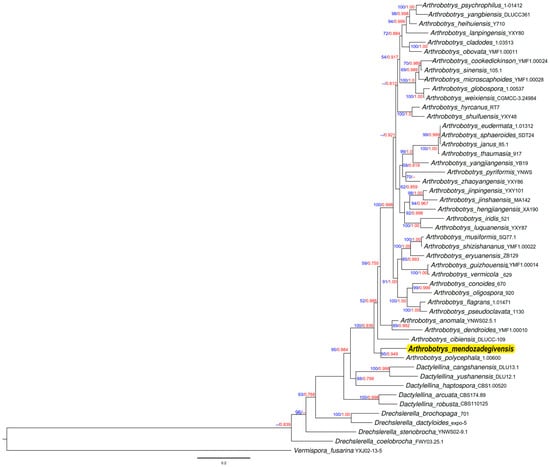 The phylogenetic analysis was conducted using sequences obtained from the ITS, TEF1-α, and RPB2 regions. Alignments for each region were created using the NCBI-BLAST tool. All species reported in the Index Fungorum from the Arthrobotrys genus were searched for in the NCBI nucleotide database, and those with sequences from all three regions were included. Additionally, some species from the Dactylellina and Drechslerella genera, also with three reported regions in the NCBI database, were added to the analysis. In total, 39 species of Arthrobotrys, 5 of Dactylellina, and 4 of Drechslerella were included, with Vermispora fusarina (strain YXJ02-13-5) serving as the outgroup species (see Table 1). Multiple alignments for each region were performed using the CLUSTAL algorithm within MEGA Software (v11.0.13). BioEdit (v7.2.5) and MEGA software were utilized to edit and link the three alignments. The best substitution model was determined using jModelTest (v2.1.10), based on the Akaike Information Criterion (AIC). The optimal models were TIM2e + G4 for ITS and SYM + I + G4 for TEF1-α and RPB2. Maximum likelihood analysis was conducted using IQTREE software (v1.6.12), with statistical bootstrap support values obtained through ultrafast bootstrapping with 10,000 replicates. Additionally, Bayesian inference analysis was performed using MrBayes software (v3.2.6). The dataset was partitioned, and equivalent substitution models were applied. Four simultaneous Markov chains were run for 10,000,000 generations, with trees sampled every 1000 generations. The final 90% of the trees were used to estimate the posterior probabilities for the consensus tree. FigTree software (v1.4.4) was used to visualize the tree, while Photoshop CS6 (Adobe Systems, San Jose, CA, USA) and Microsoft PowerPoint (2016) were employed to edit the obtained consensus tree.