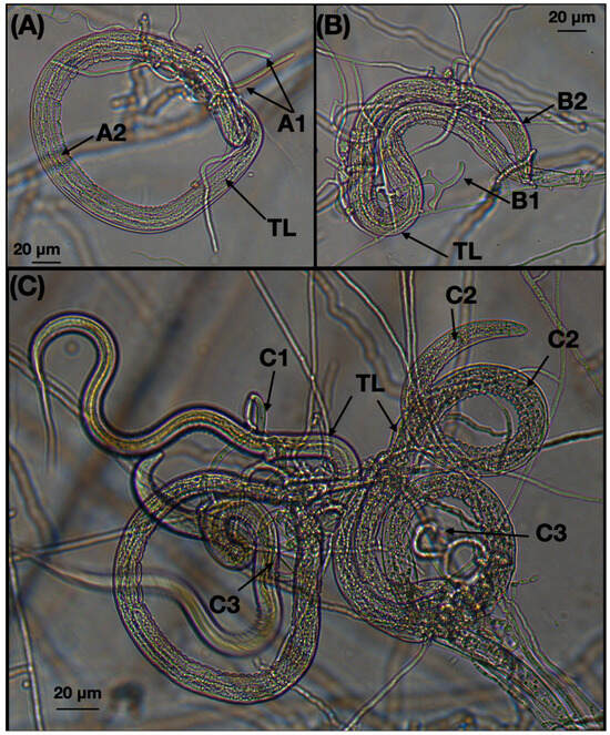 Photographs taken from a Leica Digital Microscope showing Haemonchus contortus infective larvae trapped in the three-dimensional adhesive nets (A–C). (TL) trapped larva; (A1) hyphae emerging from a trapped nematode body; (A2,B2,C2) invasive hyphae colonizing the intestinal tissues of larvae; (B1,C1) developing adhesive nets; (C3) three-dimensional adhesive nets.