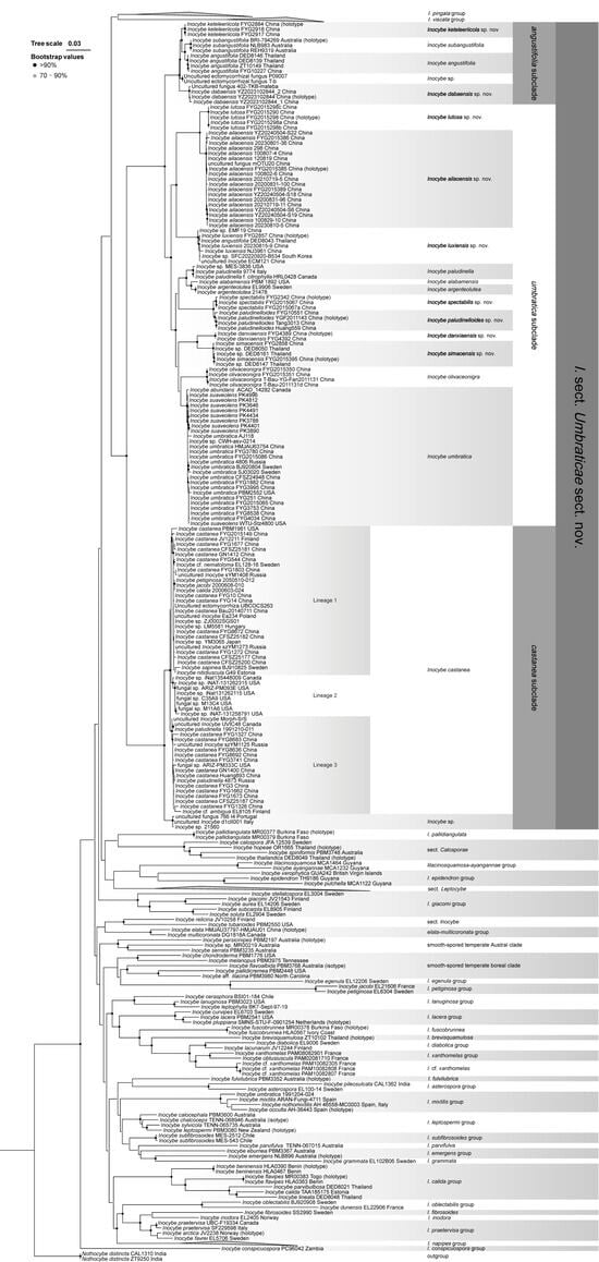 Maximum likelihood phylogenetic tree of a combined dataset of Inocybe nuclear gene sequences (ITS, LSU, and rpb2), with Nothocybe distincta (ZT9250 and CAL1310) used as outgroups. ML bootstrap percentages (ML-BP) ≥ 70 are shown at each internode. New species are in bold.