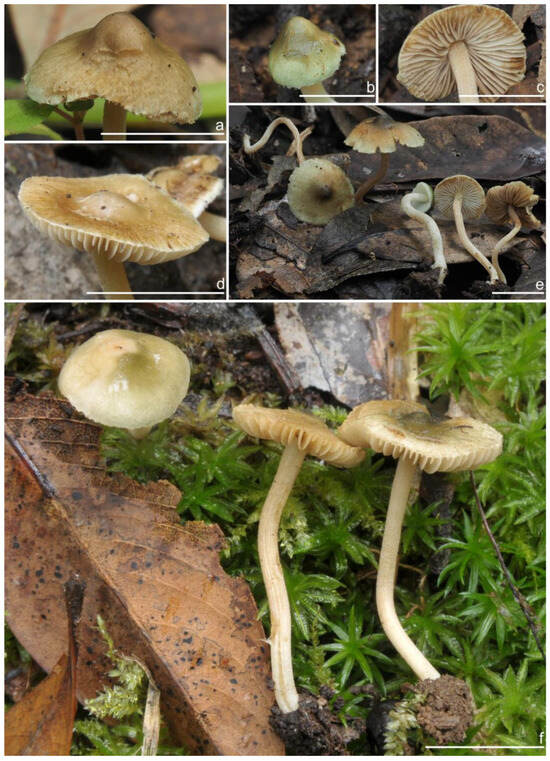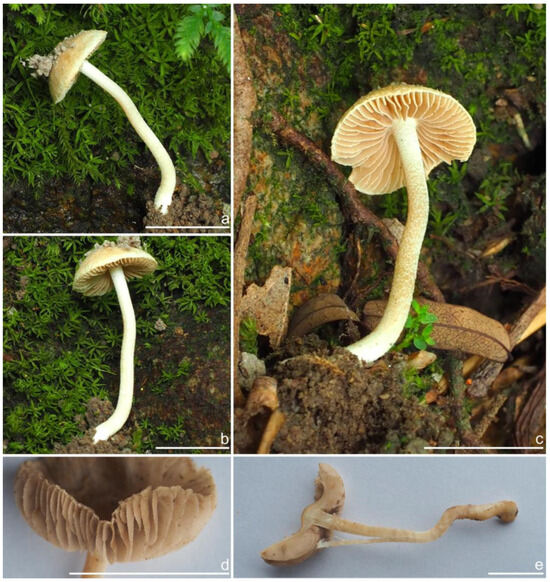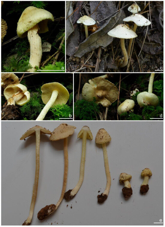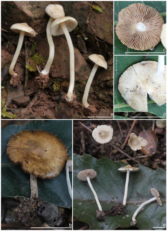 Basidiomata of Inocybe ailaoensis. (a) FYG2015385 (FCAS3848, holotype); (b) HMLD4191; (c–e) HMLD4188; Scale bars: 10 mm. (a) Photo by Y.-G. Fan. (b–e) Photos by Y. Liu.