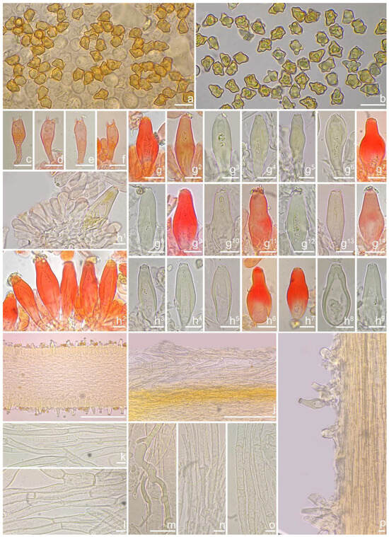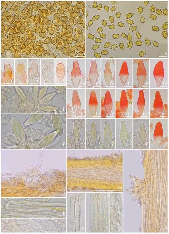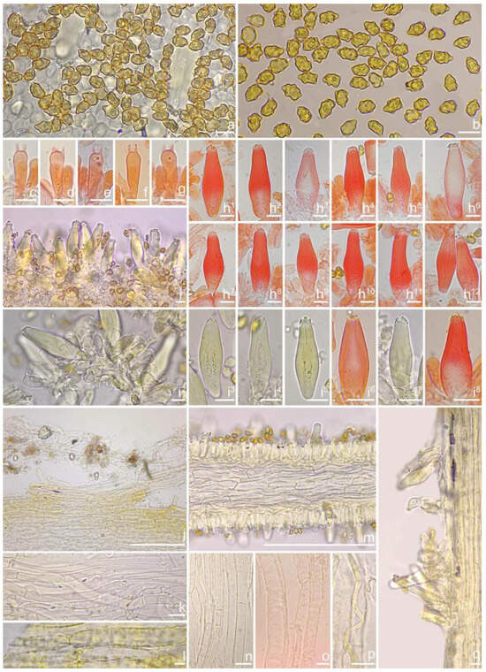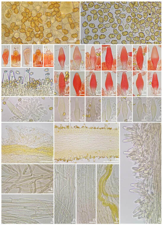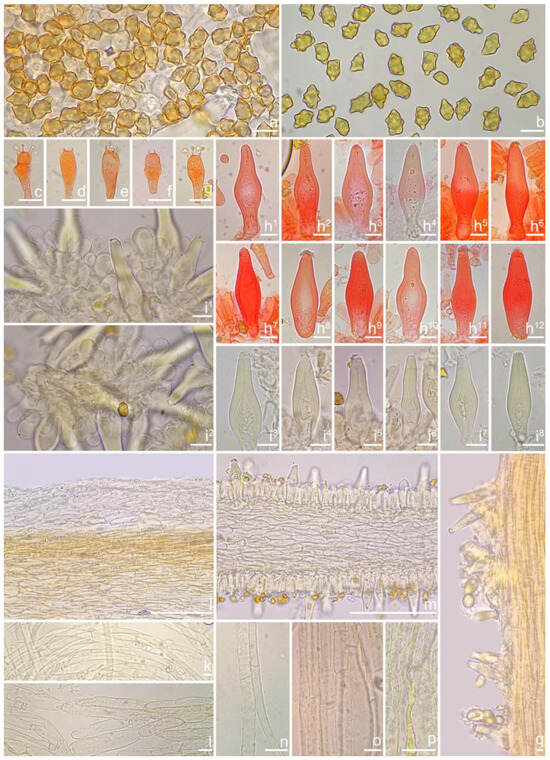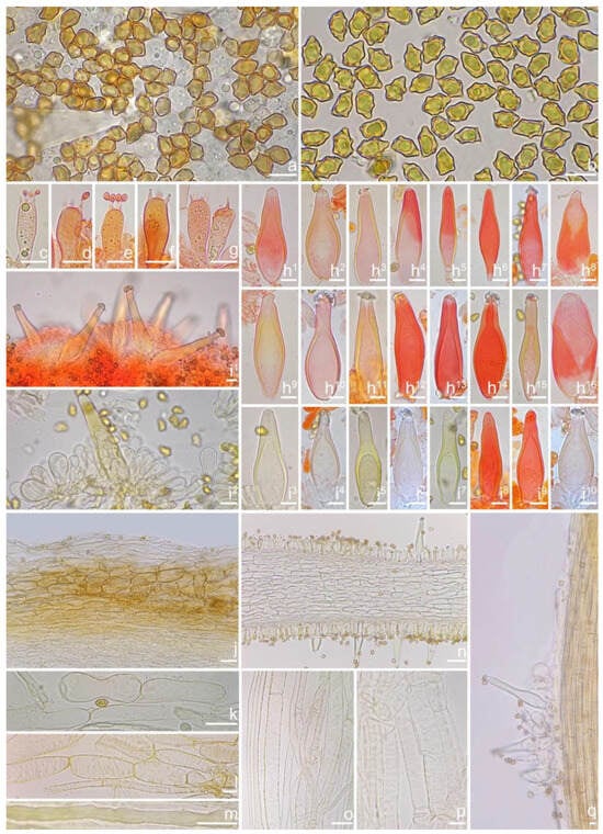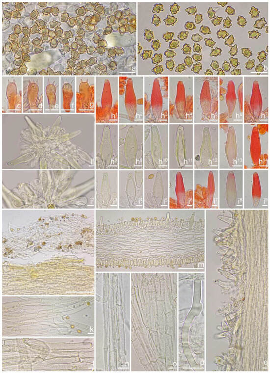 Microscopic features of Inocybe danxiaensis (FCAS3837, holotype). (a,b) Basidiospores. (c–g) Basidia. (h1–h12) Pleurocystidia. (i1–i8) Cheilocystidia and cheiloparacystidia. (j) Pileipellis. (k) Pileipellis upper layer hyphae. (l) Pileipellis lower layer hyphae. (m) Cross-section of lamellae. (n) Stipitipellis hyphae. (o) Stipe trama hyphae. (p) Oleiferous hyphae. (q) Stipitipellis with caulocystidia. Scale bars: (a–i8,k–l,n–q) 10 μm, (j,m) 100 μm. Photos by X. Chen.