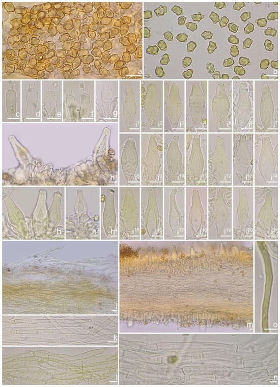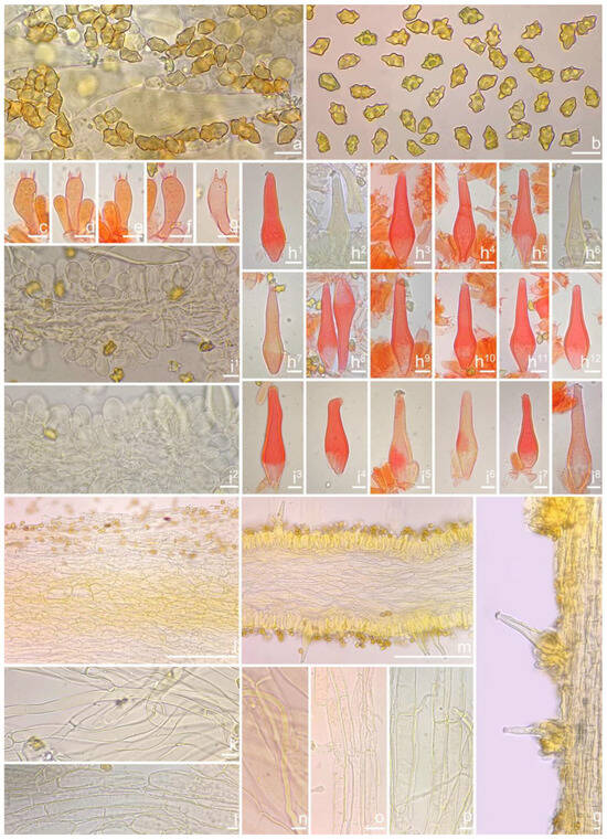 Basidiospores [n = 100/2/2] (6.0) 6.1–7.1–8.1 (8.9) × (4.1) 4.2–5.1–5.8 (6.2) μm, Q = (1.13) 1.20–1.42–1.64 (1.77), Qm ± SD = 1.42 ± 0.126, angular–nodulose with 7–15 small nodules, pale yellow to goldish-yellow, with an inconspicuous subconical knob at apex, apiculus indistinct, with intracellular circular to amorphous oil inclusions. Basidia 18–26 × 6–8 μm, mostly claviform to narrowly claviform, hyaline, thin-walled, mostly 4-sterigmate, but 2-sterigmate basidia occasionally observed, sterigmata 2–4 μm in length. Pleurocystidia 33–45–53 × 12–14–17 μm (n = 40), abundant, mostly fusiform and broadly fusiform, occasionally lageniform, crystallization present at the obtuse apices, base nearly rounded to obtuse, thick-walled, walls up to 3 μm wide at the middle and strikingly thickened near the apex (up to 5 μm), pale yellowish. Cheilocystidia 28–34–47 × 10–14–16 μm (n = 40), abundant, resemble pleurocystidia, mostly fusiform to broadly fusiform, at times sublageniform. Cheiloparacystidia 8–17 × 4–7 μm, clavate to oblong, hyaline, colorless, thin-walled, mixed with cheilocystidia. Caulocystidia 34–45–56 × 10–15–19 μm (n = 30), descending to stipe base, fusiform, lageniform, or broadly lageniform, thick-walled, crystallization at apices. Cauloparacystidia 10–16 × 6–10 μm, abundant, pyriform, ovoid, clavate, or oblong, thin-walled, colorless, mixed with caulocystidia. Hymenophoral trama 40–70 μm thick, regularly arranged, hyphae thin-walled, colorless, smooth, slightly inflated, 3–15 μm wide, cylindrical hyphae occasionally observed. Pileipellis divided into two layers, upper layer interwoven, colorless, 65–125 μm thick, hyphae cylindrical, smooth, thin-walled, 2–6 μm wide; lower layer regularly arranged, hyphae slightly inflated, 5–13 μm wide, yellowish to yellowish-brown, indistinctly encrusted or rough. Pileal trama 350–500 μm thick, subregularly arranged, colorless, hyphae 5–16 μm wide, smooth, thin-walled, inflated. Stipitipellis regularly arranged, pale yellowish in color, composed of cylindrical hyphae, 5–16 μm wide, thin-walled, smooth. Oleiferous hyphae 1–4 µm wide, yellowish, diverticulate, mostly present in the pileal and the stipe trama. Clamp connections present and common in all tissues.