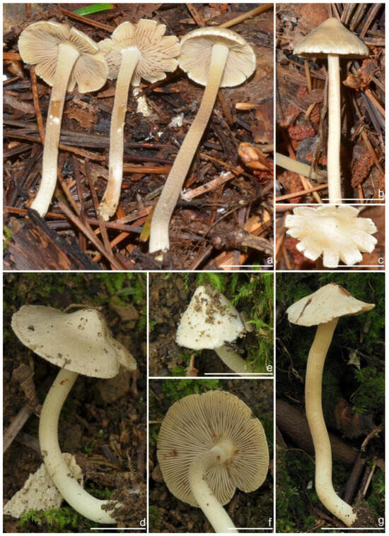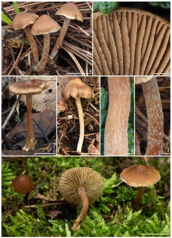 Basidiomata of Inocybe castanea (a,f) FYG2015149 (FCAS3852); (b,e) FYG544-2020 (FCAS3854); (c) FYG10-2020 (FCAS3853); (d) FYG1677 (FCAS3857); (g) FYG1803 (FCAS3856). Scale bars: (a–g) 10 mm. Photos by Y.-G. Fan.