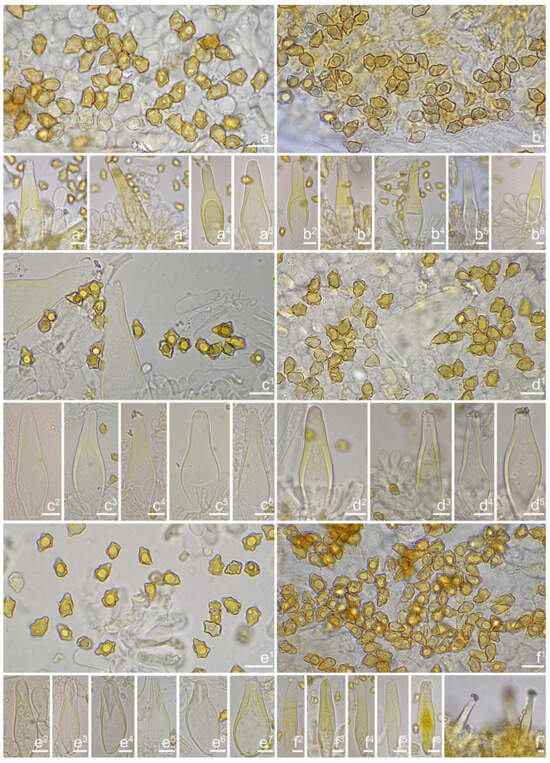 Basidiospores [100/2/2] (5.9) 6.9–7.9–8.6 (9.5) × (4.2) 4.8–5.1–5.9 (6.5) μm, Q = (1.21) 1.32–1.47–1.71 (1.93), Qm ± SD = 1.47 ± 0.12, angular with 10–14 small nodules, apiculus indistinct, with a prominent conical knob at apex, pale yellowish to yellow, with one or more intracellular circular to oblong oil inclusions. Basidia 20–28 × 6–11 μm, mostly claviform, broadly claviform or ventricose, hyaline, mostly 4-spored, sterigmata 2–5 μm in length. Pleurocystidia 35–45–54 × 11–14–19 μm (n = 40), mostly fusiform, broadly fusiform, or lageniform, crystallization present at the obtuse apices, base nearly rounded to subtruncate, thick-walled, walls up to 3 μm wide, yellowish, extremely abundant. Cheilocystidia 34–45–61 × 11–17–22 μm (n = 40), resemble pleurocystidia, mostly fusiform, lageniform or broadly fusiform. Cheiloparacystidia 13–20 × 6–10 μm, clavate to broadly clavate, smooth, hyaline, thin-walled, mixed with numerous metuloidal cheilocystidia. Caulocystidia 30–46–68 × 12–15–17 μm (n = 20), mostly fusiform, lageniform or broadly fusiform, at times ventricose, distributed the entire stipe length, thick-walled, walls up to 3 μm thick, pale yellow. Cauloparacystidia 13–21 × 7–12 μm, oblong or clavate, thin-walled, colorless, mixed with caulocystidia. Hymenophoral trama 50–113 μm thick, subregularly arranged, colorless, composed of thin-walled, colorless, smooth, mostly inflated and cylindrical hyphae, 4–21 μm wide. Pileipellis divided into two layers, 90–180 μm wide, upper layer interwoven, colorless, hyphae cylindrical, rough, thin-walled, not hyaline, at times oily yellow, 3–7 μm wide; lower layer regularly arranged, pale yellow–brownish, rough, hyphae 8–17 μm wide. Pileal trama regularly arranged, composed of inflated hyphae up to 20 μm in diameter, colorless, smooth, thin-walled. Stipitipellis a cutis composed of pale yellow, cylindrical hyphae, thin-walled 2–9 μm wide, smooth. Oleiferous hyphae 2–5 µm wide, colorless, diverticulate, mostly present in stipe and hymenophoral trama. Clamp connections present and common in all tissues.
