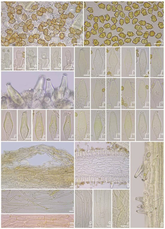 Microscopic features of Inocybe dabaensis (FCAS4009, holotype). (a,b) Basidiospores. (c–h) Basidia. (i1–i6) Cheilocystidia. (j1–j18) Pleurocystidia. (k) Pileipellis. (l) Pileipellis upper layer hyphae. (m) Pileipellis lower layer hyphae. (n) Cross-section of lamellae. (o) Stipitipellis with caulocystidia. (p) Stipitipellis hyphae. (q) Stipe trama hyphae. (r) Oleiferous hyphae. Scale bars: 10 μm. Photos by X. Chen.