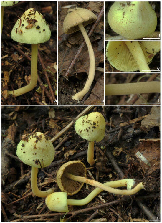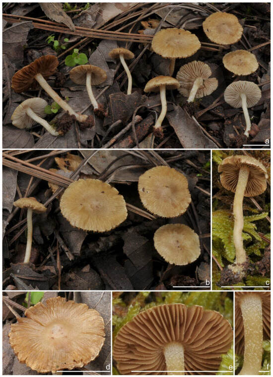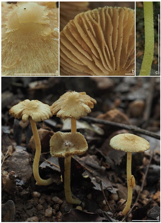 Basidiomata of Inocybe danxiaensis. (a,b,d) FYG4389 (FCAS3837, holotype); (c) FYG4392 (FCAS3838). Scale bars: (a) 0.5 mm; (b) 1 mm; (c,d) 10 mm. Photos by Y.-G. Fan.