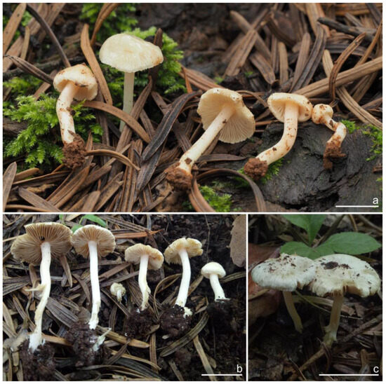 Inocybe paludinella (Peck) Sacc. was originally described as Agaricus paludinellus Peck from Sand Lake, New York in 1879 and subsequently combined into the genus Inocybe by Saccardo in 1887. This species has been in lowland and wet habitats (original description), as well as under frondose and coniferous forests [37,38,39]. It can be confused with white and some grayish species I. umbratica Quél., which were originally described from France in 1884 and widely reported in northern temperate regions, including Europe [37,40,41], East Asia [19], and North America [42]. The latter species occurs in coniferous forests under Picea, Abies, or Larix. These two species share a slender habit, silver–white to yellowish basidiomata, a thin pileus with narrow lamellae, angular–nodulose basidiospores, and abundant thick-walled hymenial cystidia, as well as an overlapped ecology. Stangl (1975) proposed that these two species should be united [43], a view that was accepted by Breitenbach and Kranzlin (2000) [39], but most European mycologists treated them as separate species, with the distinction of yellow-ocherish basidiomata of I. paludinella even when young [37,38,44]. Inocybe paludinella was more often placed in I. sect. Marginatae [18,45], while Bon (1998) assigned I. paludinella and I. umbratica to I. sect. Petiginosae. However, a series of molecular phylogenetic studies demonstrated that I. sect. Marginatae typified by I. asterospora Quél. was polyphyletic [46,47,48,49].