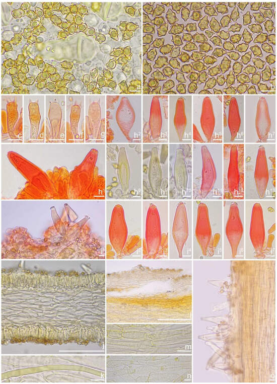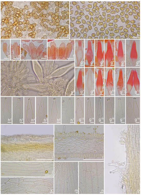 Microscopic features of Inocybe angustifolia (FCAS4010). (a,b) Basidiospores. (c–g) Basidia. (h1–h4) Cheilocystidia and cheiloparacystidia. (i1–i21) Pleurocystidia. (j) Pileipellis. (k) Pileipellis upper layer hyphae. (l) Pileipellis lower layer hyphae. (m) Cross-section of lamellae. (n) Hymenophoral trama hyphae. (o) Oleiferous hyphae. Scale bars: 10 μm. Photos by X. Chen.