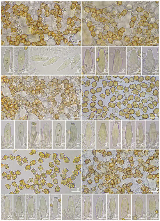 Basidiospores and hymenial cystidia of Inocybe castanea. (a1–a5) FYG3741 (FCAS3859); (b1–b6) FYG1677 (FCAS3857); (c1–c6) FYG1327 (FCAS3863); (d1–d5) FYG1803 (FCAS3856); (e1–e7) FYG1400 (FCAS3860); (f1–f7) FYG544-2020 (FCAS3854). Scale bars: 10 μm. Photos by X. Chen.