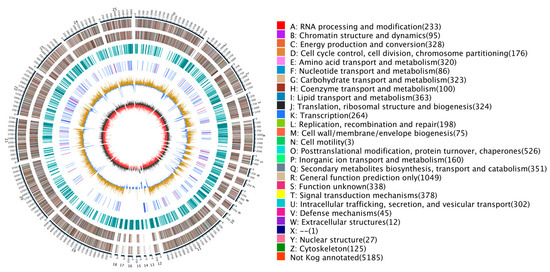 Genomic map of N. oryzae. The outermost circle is a marker of genome size, with each demarcation representing 5 kb, that shows the entire genome size of N. oryzae ZQ1 of 42.09 Mb. The second and third circles from the outside show positions of genes coded by plus and minus strands of the genome, respectively. The function and gene number annotated by COG are listed on the right of the figure whereby each function corresponds to a color and each color corresponds to a different COG functional classification. The fourth circle shows repeating sequences. The fifth circle shows genes coding for tRNA and rRNA, where blue and purple represent tRNA and rRNA, respectively. The sixth circle shows the GC content; the light yellow part shows that GC content is higher than the mean GC content of genome—the higher the peak value is, the bigger the difference is—and the blue part shows that GC content is lower than the mean GC content of genome. The innermost circle shows the GC-skew, with dark gray representing regions where G is greater than C and red representing regions where C is greater than G. Circos (https://circos.ca/, accessed on 21 January 2023) was used as the drawing program.