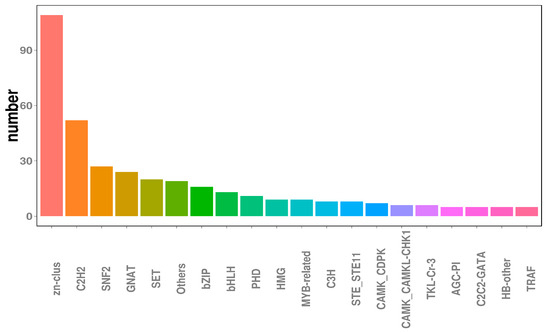 Transcription factors (TFs), which are essential for modulating diverse biological processes, regulate gene expression and play central roles in the development and evolution of organisms [45]. Ultimately, the functional annotation approach used in this study enabled the identification of 491 TF-encoding genes, transcription regulators, and protein kinases within the N. oryzae genome, accounting for 4.62% of all predicted genes. As for other fungi, genes encoding TFs (245 members) and transcription regulatory proteins (139 members) represented the two largest classes of TFs in N. oryzae, accounting for approximately 49.9% and 28.3% of predicted TFs, respectively, followed by Zn-clus finger TFs (109 members) and C2H2-type zinc finger TFs (52 members), which, respectively, accounted for approximately 22.20% and 10.59% of predicted TFs (Figure 3).