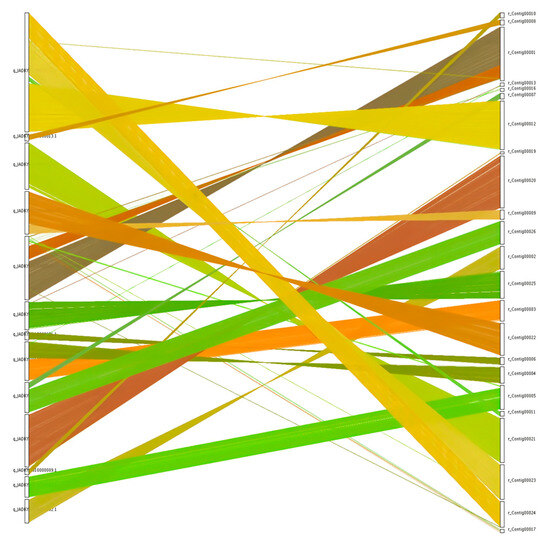 Collinearity of genome between GZL1 and ZQ1. Comparisons of ZQ1 protein sequences with the reference genome GZL1 were made through BLAST analysis. Nucleic acid level crosstalk between the genomes pairs was then obtained based on the position of the homologous genes on the genome sequence with different colour and plotted using MCScanX.
