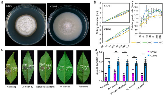 Two strains of Pseudofabraea citricarpa differ in morphology and pathogenicity. (a) Compared the colony morphology of two different strains of fungi from different sources. The colony pictures were taken when the CQWZ strain had grown to two-thirds of the petri dish. (b) Comparison of the growth rates of the two strains at 10 °C, 20 °C and 30 °C. (c) Relative growth rates of strain CQWZ at three temperatures relative to that of strain SXCG. (d) Differences in pathogenicity between two strains of P. citricarpa on several citrus varieties. (e) Lesion diameter statistics, ** p < 0.01, and *** p < 0.001.
