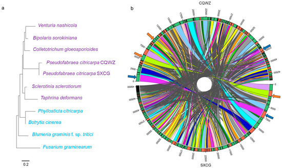 Evolutionary relationships of Pseudofabraea citricarpa. (a) Maximum likelihood trees of Pseudofabraea citricarpa. (b) Genomic colinearity analysis between SXCG and CQWZ. The colored regions represent the areas which are aligned in the sequence alignment. Each line represents an alignment record. If the alignment is in the forward direction, the outer ring of the alignment region is the same color. If the alignment is in the reverse direction, the outer ring color is different.