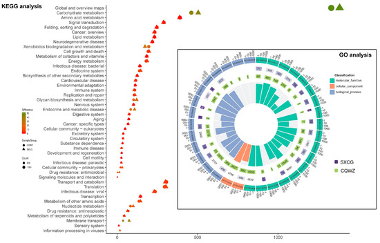 Differences in gene annotation between two strains. Differences in gene annotation between two strains in the KEGG database. Circles represent CQWZ strains and triangles represent SXCG strains. Change from red to green indicates the difference in the number of genes between the two strains. Differences in gene annotation between the two strains in the GO database. The numbers in the inner circle represent the number of genes in the two strains. The bars indicate the difference in the number of genes in the pathway between the two strains. The higher the bar, the less obvious the overall difference in the number of genes between the two strains. The absence of a bar means that a certain strain has no genes in this pathway.