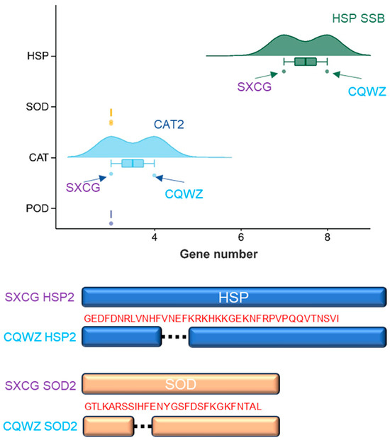 Mechanisms of high temperature adaptation differences between two strains. Comparison of the quantity and amino acid sequence of HSP, SOD, CAT, and POD in two different strains.