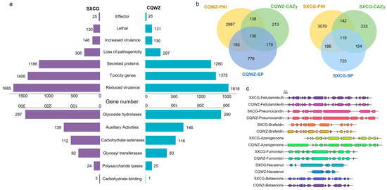 Mechanisms of difference in the pathogenic systems of the two strains. (a) Differences in the number of pathogenesis-related genes in SXCG and CQWZ. Purple indicates SXCG strains, and blue indicates CQWZ strains (b) Screening for core virulence factors of SXCG and CQWZ. (c) Differences in gene clusters for secondary metabolite synthesis.