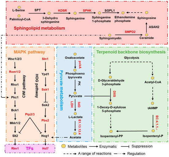 To understand the key factors contributing to the enhanced heat resistance and pathogenicity of CQWZ, a comprehensive analysis was conducted. This analysis revealed four factors associated with high-temperature tolerance and pathogenicity, namely the MAPK pathway, pyruvate metabolism, terpenoid backbone biosynthesis, and sphingolipid metabolism (Figure 6). Variations in the sequences of essential genes involved in the sphingolipid metabolism pathways, including KDSR, SPHK, ASAH2, and SMPD2, as well as those genes in the terpenoid skeleton biosynthesis pathway like DXS, were observed. There were also differences in genes associated with pyruvate metabolism, such as pckA, LDH, and ldD, and a regulatory relationship exists between these four pathways. The sphingolipid pathway regulates Pkc1 through the formation of diacylglycerol [26], acetate induces activation of Hog1 [27], the first step of the nomevalonate pathway involves the synthesis of 1-deoxy-d-xylulose 5-phosphate (DXP) through the condensation of pyruvate and glyceraldehyde 3-phosphate via DXP synthase catalysis [28].