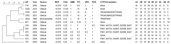 | LIF | Year | Mutations in cyp51A | MEC/MIC (µg/mL) * | |||||