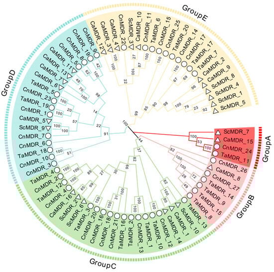 To analyze the TaMDR, CnMDR, CaMDR, and ScMDR gene structures and conserved motifs, the exon introns of MDR proteins were analyzed and visualized using the online Gene Structure Display Server tools (GSDS, http://gsds.cbi.pku.edu.cn/ (accessed on 2 October 2023)) []. The MEME program (http://alternate.meme-suite.org/tools/meme (accessed on 4 October 2023)) was used to identify conserved motifs in the MDR sequence, with the number of motifs set to 15 and the minimum and maximum widths set to 10 and 50, respectively [].