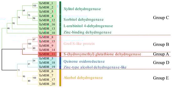 In addition, a phylogenetic tree of TaMDRs was constructed, which was divided into five branches, as shown in Figure 1, and the relevant annotation information for each gene was marked (Figure 2). Among the 20 TaMDRs identified, only TaMDR_11 encoding S-(hydroxymethyl) glutathione dehydrogenase was present in Group A. Group B encoded a GroES-like protein, which is a marker protein encoded by the ADH_N domain. Group C contained three xylitol dehydrogenases, two sorbitol dehydrogenases, and one L-arabinitol 4-dehydrogenase. Group D included two quinone oxidoreductases, two zinc-bound dehydrogenases, and one zinc-type alcohol dehydrogenase-like protein. A total of four alcohol dehydrogenases were identified.