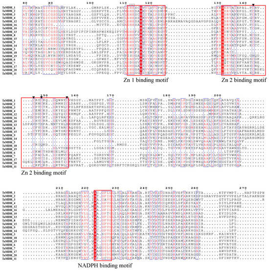 Protein sequence alignment of all identified TaMDRs. The red background means the amino acids are identical. The red frames represent the binding motifs of Zn1, Zn2, and NADPH, respectively. White triangles represent catalytic zinc ligand residues, and black triangles represent structural zinc ligand residues.