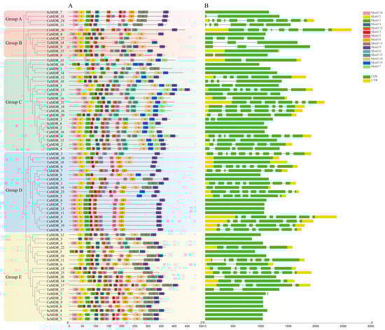 Phylogenetic tree, gene structure, and conserved motifs of MDRs. (A) Phylogenetic tree and motif analysis; the length of the solid line represents the length of the protein sequence. Colored boxes represent different motifs. (B) Gene structure analysis of the MDRs. Yellow boxes indicate untranslated regions (UTR) regions; green boxes indicate CDS regions; introns are indicated by black lines. The scale at the bottom is in base pairs (bp).