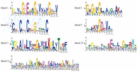 Next, we analyzed the conserved motifs present in the MDRs and found a total of 15 conserved motifs in genes with higher homology and similar protein motif compositions (Figure 4A and Figure 5, and Supplementary Figure S1). Motifs 1, 2, 3, 5, and 12 were detected in most of the MDR gene sequences. Motif 1 is a Zn 1-binding motif that was detected in 63 MDRs. Motif 3 (an NADPH-binding motif) was detected in all MDRs. Together, motifs 4 and 5 form the Zn 2-binding motif, with motif 4 containing four cysteine coordination residues of the zinc structure. Motif 5 was not detected in Sc_MDR7, and 51 genes contained motif 4. Motif 11 was the characteristic motif of Groups A and E. Motifs 7 and 15 were the characteristic motifs of Group C. Motifs 4 and 7 were absent in Group D, similar to the results of TaMDRs multiple sequence comparisons.