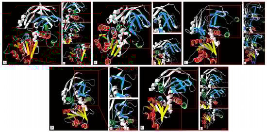 - Waterhouse, A.; Bertoni, M.; Bienert, S.; Studer, G.; Tauriello, G.; Gumienny, R.; Heer, F.T.; de Beer, T.A.P.; Rempfer, C.; Bordoli, L.; et al. SWISS-MODEL: Homology modelling of protein structures and complexes. Nucleic Acids Res. 2018, 46, W296–W303. [Google Scholar] [CrossRef]