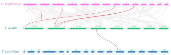 Comparative linear relationship of MDRs in C. neoformans, T. asahii, and S. cerevisiae. 1–14 represents the chromosome number of C. neoformans, and I–XVI represents the chromosome number of S. cerevisiae.