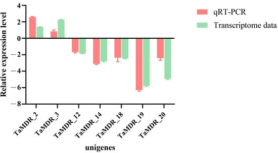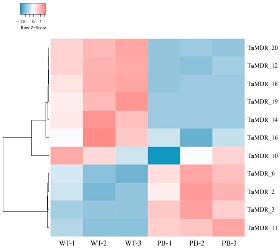 Ribonucleic acid sequencing (RNA-seq) was performed on WT and PB strains, and the |Log2 fold change (Log2FC)| > 0.5 and false discovery rate < 0.05 were used to identify differentially expressed genes (DEGs). Eleven DEGs were differentially altered in the resistant strain, and seven were downregulated in the resistant strain (Figure 9). TaMDR_19 and TaMDR_20 exhibited the most significant differences in expression among the resistant strains and were downregulated by 5.8- and 5-fold, respectively. TaMDR_3 was the most significantly upregulated gene, with a 2.25-fold upregulation.