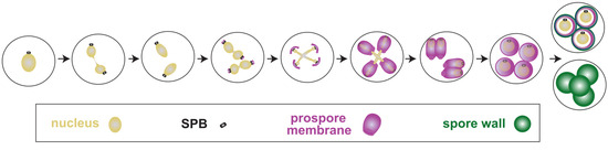 - Knop, M.; Strasser, K. Role of the spindle pole body of yeast in mediating assembly of the prospore membrane during meiosis. EMBO J. 2000, 19, 3657–3667. [Google Scholar] [CrossRef] [PubMed]