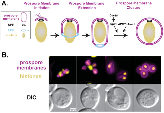 - Shimoda, C. Forespore membrane assembly in yeast: Coordinating SPBs and membrane trafficking. J. Cell Sci. 2003, 117, 389–396. [Google Scholar] [CrossRef] [PubMed]