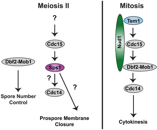 - Paulissen, S.M.; Hunt, C.A.; Seitz, B.C.; Slubowski, C.J.; Yu, Y.; Mucelli, X.; Truong, D.; Wallis, Z.; Nguyen, H.T.; Newman-Toledo, S.; et al. A Noncanonical Hippo Pathway Regulates Spindle Disassembly and Cytokinesis During Meiosis in Saccharomyces cerevisiae. Genetics 2020, 216, 447–462. [Google Scholar] [CrossRef]