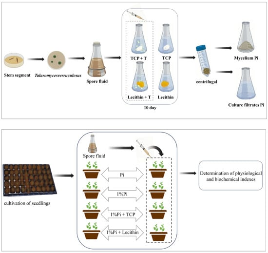 In order to accurately study the effect of T. verruculosus in mediating plant absorption of phosphorus, this study selected cucumber as the experimental material for a total of eight treatments, as follows: normal concentration Pi: 1 mM KH2PO4 (P); Pi+ T. verruculosus (PT); apply low concentration Pi:10 μm KH2PO4 (DP); 1%Pi+ T (DPT); 1%Pi +Ca3(PO4)2 (TP); 1%Pi + Ca3(PO4)2 +T (T%Pi + T); 1%Pi + Lecithin (LP); 1%Pi + lecithin + T (LP + T). Each treatment contained 3 pots, and each pot contained two seedlings. The flowerpots were 20 cm in diameter and 17 cm in height. The experimental treatment started with four leaves of one heart stage. The spore solution was diluted to 1 × 108 cfu/mL, and then 10 mL of spore solution was injected into the root of each seedling by syringe once a week for a total of 4 weeks. Hoagland nutrient solution 100 mL with a phosphorus deficiency of 1/2 was poured once a week into each basin. The soluble phosphorus in the applied phosphorus was KH2PO4, the normal phosphorus concentration was 1 mmol/L, the low phosphorus concentration was 10 μmol/L, the inorganic insoluble phosphorus source was Ca3(PO4)2, and the organic insoluble phosphorus source was yolk lecithin. The K + concentration in the nutrient solution was supplemented with KCI. Cucumber seedlings were harvested after four weeks of treatment, and a physiological and biochemical analysis was performed (Figure 1). During the growth of cucumber seedlings, the temperature was 28 °C during the day, 18 °C at night, the humidity was 60~70%, and the light conditions were 14 h light and 10 h darkness.