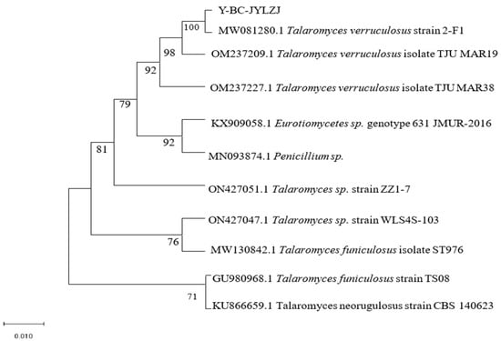 In this study, the genomic DNA of 21 strains of fungi was used as the material for the molecular detection of each strain, and the 16S rRNA gene sequencing results of 21 strains of fungi were compared in the NCBI database. After sequencing and comparison, 10 strains were obtained (Table 3). They fall into six genera: Basiliformis, Trichoderma, Trichoderma, Mucor, Streptispora, and Parasitospora. According to relevant reports, Talaromyces flavus has the ability to dissolve phosphorus [38]. In addition, Talaromyces flavus and strain 19 are from the same genus of fungi; thus, strain 19 was further studied, and the phylogenetic tree of strain 19 Y-BC-JYLZJ was constructed using the MEGA 7.0 software [39]. The results showed that Y-BC-JYLZJ was most similar to MW081280.1 T. verruculosus strain 2-F1, with a similarity of 100% (Figure 2). Combined with the morphological characteristics, Y-BC-JYLZJ was identified as T. verruculosus.