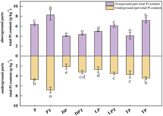 Pi contents in aboveground and underground parts of cucumber seedlings. Values are expressed as means ± SD (n = 6). Different letters denote significant differences between treatments (p < 0.05).
