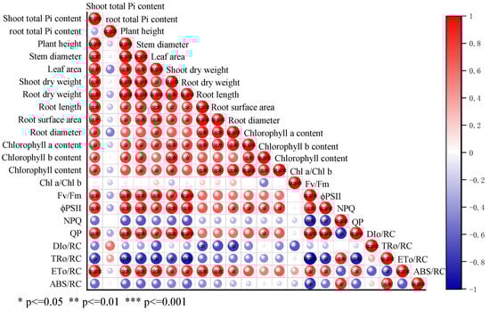 According to the results (Figure 3), the aboveground Pi content of cucumber seedlings treated with T. verruculosus was significantly higher than that of cucumber seedlings treated without T. verruculosus. The application of T. verruculosus under low phosphorus stress did not significantly improve the Pi content of plants, and the Pi content of the TPT treatment was 75.25% higher than that of the TP treatment. Under the treatment of LPT and TPT, the Pi content in the aboveground and underground parts was increased by 74.5% and 61.4%, respectively, indicating that T. verruculosus promoted the absorption of Pi in the aboveground parts. The results of the correlation analysis show that the surface morphological indexes, root parameters, chlorophyll content, chlorophyll a fluorescence parameters, and electron transport capacity of each RC were positively correlated (Figure 4).