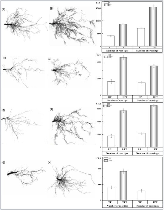 Comparison of root scan of cucumbers under different treatments, number of cross roots, and number of root tips. (A–H) root scan map. (A) Pi; (B) PT; (C) 1% Pi; (D) DPT; (E) LP; (F) LPT; (G) TP; (H) TPT; (I–L) comparison between the number of root tips and the number of crossings. (I) P, PT; (J) DP, DPT; (K) LP, LPT; (L) TP, TPT.