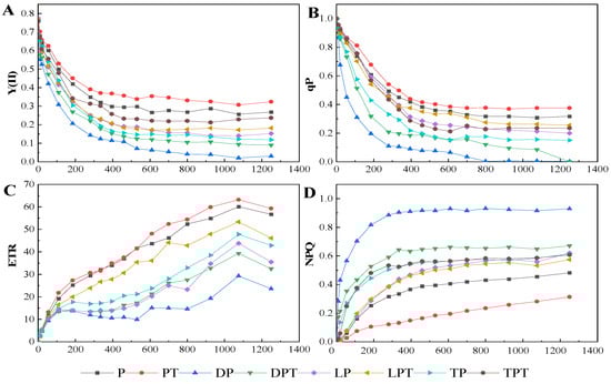 Function relationship between Y (II) (A), qP (B), ETR (C), nonphotochemical quenching (NPQ) (D), and PAR of cucumber leaves under different treatments. Values are expressed as means ± SD (n = 6).