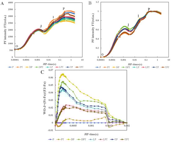Period J was higher for the LPT treatment than in the other treatments. The PF intensity and I-P amplitude of the group treated with T. verruculosus in stage I and stage P were higher than those of the group treated without T. verruculosus, and the PT treatment had the highest intensity in stage I and stage P. The intensity of DP treatment was lowest in stage I and stage P (Figure 8A). Through the normalization of the fluorescence data, WO-P was evaluated to further determine the sites where various electron transport chains were processed at the PSII receptor terminals. The normalized curve between the O and p steps was expressed as WO-P = [(Ft − Fo)/(Fm − Fo)] (Figure 8B). In the O-J and J-I phases, the intensity of PF increased significantly under Pi stress, but there was no significant change in the intensity of PF in each treatment during the I-P phase. Through the normalization of the relative fluorescence between the O phase and the J phase (Figure 8C), it was found that no K value appeared at 300 s, indicating that the damage on the donor side was less than that on the recipient side.