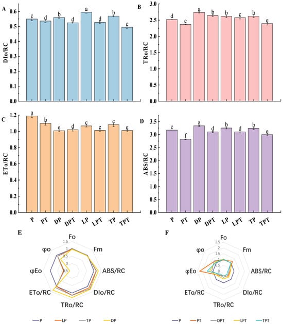 Dissipated energy flux (t = Fo) per reaction center (DIo/RC) (A), captured energy flux per reaction center (t = Fo) (TRo/RC) (B), electron transport flux per reaction center (t = Fo) (ETo/RC) of cucumber leaves under different treatments (C), and absorbed flux per reaction center (RC) (ABS/RC) (D). Radar map of the changes in JIP parameters in the leaves of cucumber seedlings treated without T. verruculosus (E). Radar map of the changes in JIP parameters in the leaves of cucumber seedlings treated with T. verruculosus (F). Values are expressed as average ± SD (n = 6). Different letters denote significant differences between treatments (p < 0.05).